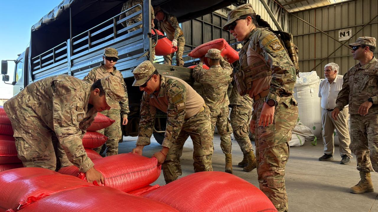 ‘Inicialmente nuestro rol estuvo orientado a contener la emergencia. Hoy, cuando la fase más compleja ya pasó, estamos apoyando en mitigar sus efectos. En este caso, colaboramos con la distribución del alimento, utilizando nuestra capacidad logística para transportar una gran cantidad de sacos y llegar oportunamente a las familias afectadas’, afirmó el Teniente Coronel Fernando Villarreal, del Ejército de Chile, explicando que la institución continúa colaborando en la etapa posterior a la emergencia más crítica.