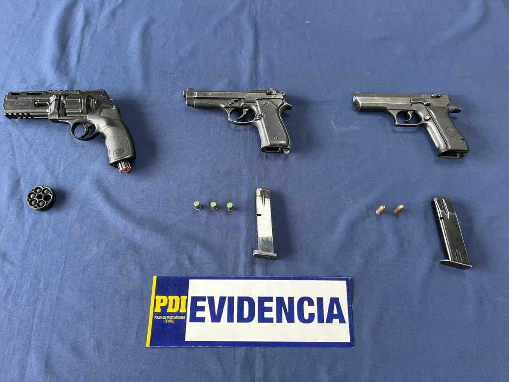 “Durante las diligencias investigativas y el registro autorizado del inmueble, los oficiales incautaron dos pistolas, un revólver, cartuchos de municiones y balines de goma, elementos que fueron levantados como evidencia por el personal especializado” señaló el Jefe de la unidad especializada subprefecto Jonathan Silva Concha.
