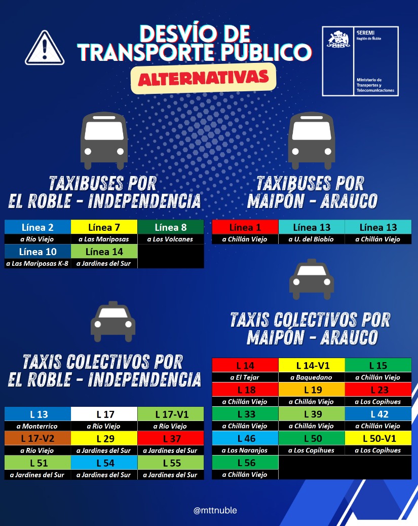 En la misma línea, el seremi de Transporte y Telecomunicaciones de Ñuble, Omar Sandoval Andrades, aseveró que ‘tras diversas reuniones sostenidas con la Dirección de Tránsito y Transporte Público de la Ilustre Municipalidad de Chillán, además de la empresa a cargo de las obras, y considerando las características viales del sector a intervenir, se definieron las rutas de desvíos de los servicios de transporte público afectados en función de sus respectivos destinos, siendo estas a través de calles El Roble-Independencia para los servicios con destino al sector suroriente, y a través de calles Maipón – Arauco para los servicios con destino al sector sur poniente. En este contexto, hacemos el llamado a todos los usuarios del transporte público, a planificar sus viajes, revisando las redes sociales de nuestro servicio, donde están las especificaciones de todos los cortes y desvíos de tránsito’.